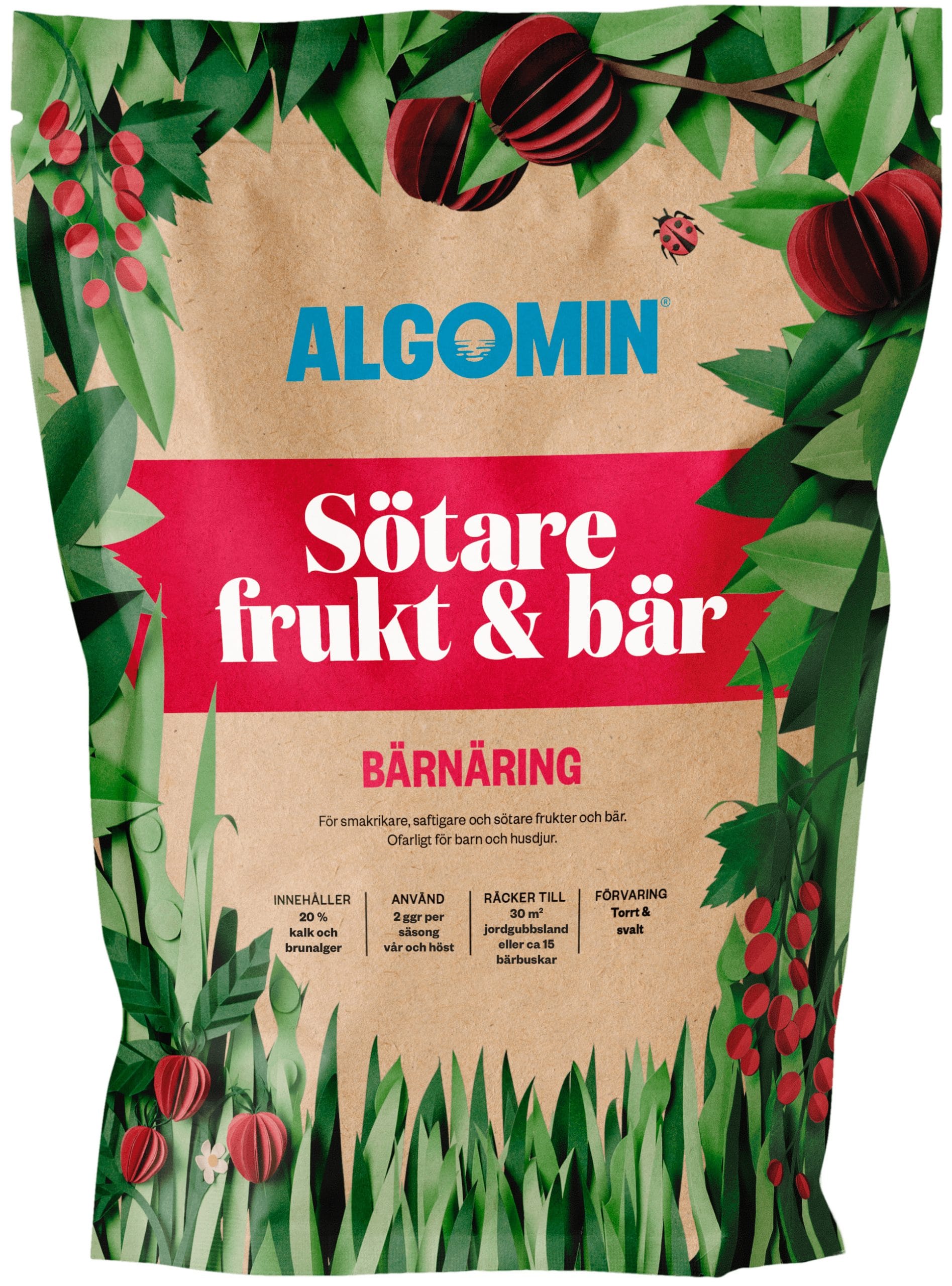 Algomin Sötare frukt & bär är en specialnäring som hjälper dina fruktträd och bärbuskar att ge smakrikare och mer näringsberikade skördar genom att arbeta under jorden genom rötterna. Kalium, fosfor och kalcium är viktiga ämnen för fruktsättning, rotbildning och näringsupptagning. Brunalgerna och kalken stimulerar de i jorden viktiga mikronäringsämnen för att få en levande jord som blir en perfekt bostad för dina växter.